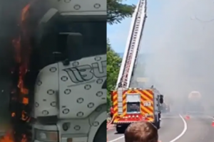 Caminhão-tanque pega fogo na descida do Morro do Boi e assusta motoristas na BR-101 em Itapema