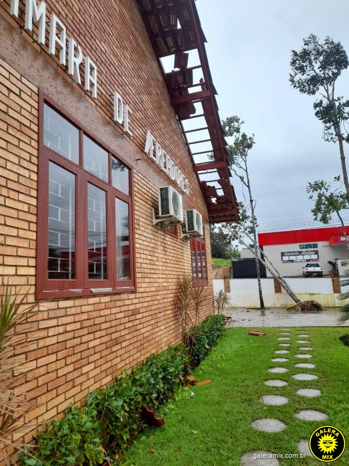 A Câmara Municipal de Vereadores de Canelinha teve grande parte de seu telhado danificado pelo destelhamento provocando pelas rajadas de vento.