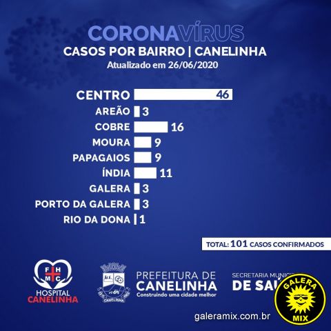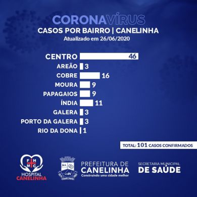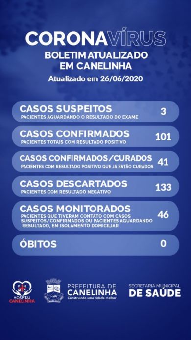 Neste momento, o município tem 101 casos confirmados (destes, 41 casos são curados), 03 casos suspeitos, 133 casos descartados, 46 pessoas monitoradas (casos monitorados sa?o a?quelas pessoas que viajaram ou tiveram contato com casos suspeitos/confirmados ou encontram-se com sintomas respirato?rios e esta?o em isolamento domiciliar) e nenhum o?bito. Estão sendo testados todos os munícipes com sintomas.
