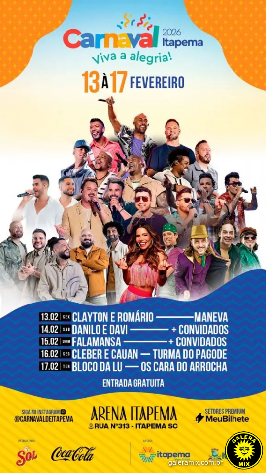 A cidade de Itapema prepara um mega Carnaval com shows nacionais gratuitos entre os dias 13 e 17 de fevereiro. A programação será realizada em uma estrutura especialmente montada na orla da Meia Praia, na altura da Rua 307, ao lado da Arena Viva Verão e do Centro de Operações Integradas (COI).