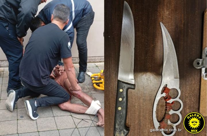 O homem demonstrava visível agitação, falava frases desconexas e afirmava estar sendo perseguido. Apresentava sinais vitais elevados e, durante conversa com os policiais, admitiu ter feito uso de cocaína e álcool. Disse portar as facas para defesa pessoal, negando intenção de agredir terceiros.