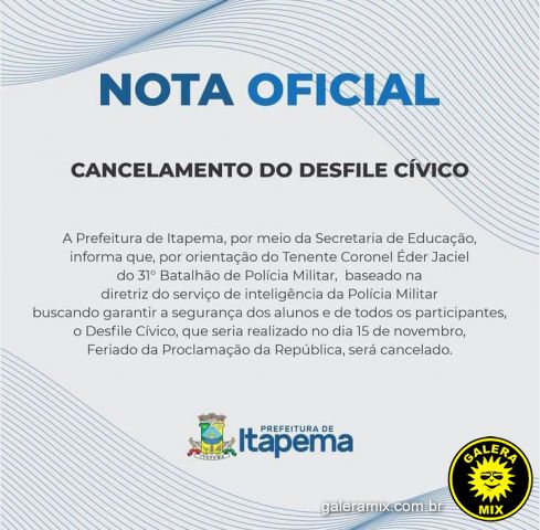 A prefeitura de Itapema emitiu um comunicado sobre o cancelamento do desfile cívico que estava marcado para a próxima terça-feira, 15, feriado de Proclamação da República. De acordo com a nota, o cancelamento foi uma orientação da Polícia Militar, buscando garantir a segurança dos alunos e participantes.