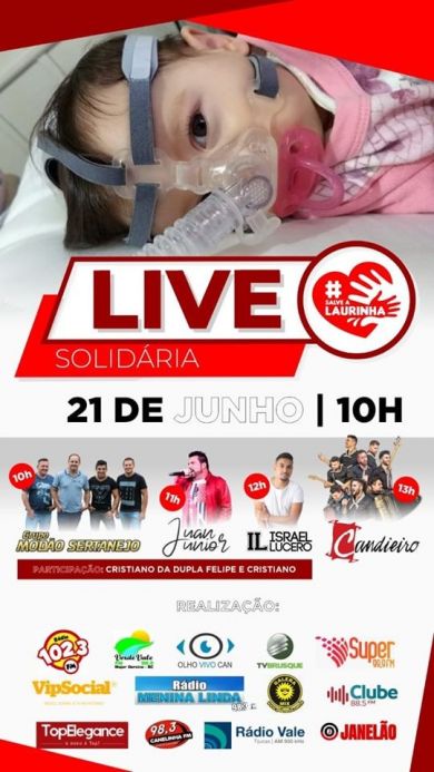 Muitas lives tem ajudado, nesta época de pandemia, famílias que tiveram sua renda comprometida pela crise, ou entidades sociais a conseguir materiais de prevenção contra a covid-19. Mas neste domingo, dia 21 de junho, com o apoio de portais de notícias e rádios da região, será realizada uma live diferente, a qual você também poderá ajudar a salvar a vida da pequena Anna Laura Orsi Batista, de apenas 9 meses, moradora de Nova Trento.