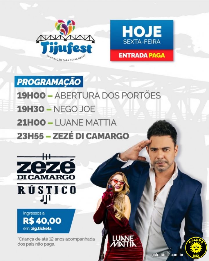 A sexta-feira da TIJUFEST promete ser um dos momentos mais marcantes da edição deste ano. Nesta noite, o palco principal recebe o cantor Zezé Di Camargo, que apresenta um show especial preparado para emocionar o público e relembrar grandes sucessos da carreira.