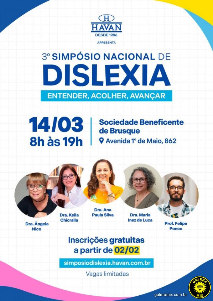 Neste sábado, 14 de março de 2026, a cidade de Brusque (SC) recebe o Simpósio Nacional sobre Dislexia, um evento que busca ampliar o debate sobre o transtorno de aprendizagem e promover mais informação para pais, educadores e profissionais da área da educação e saúde.