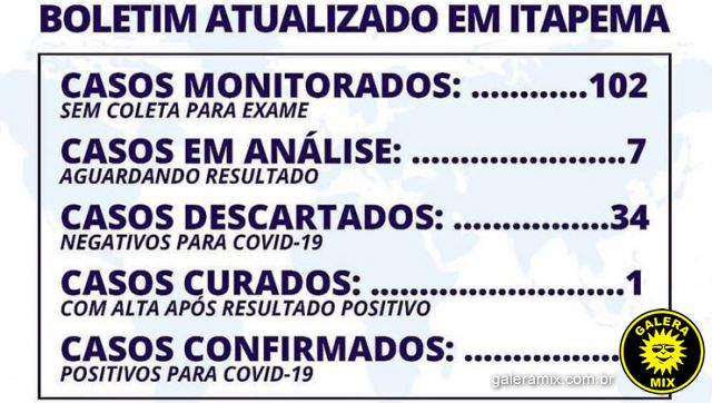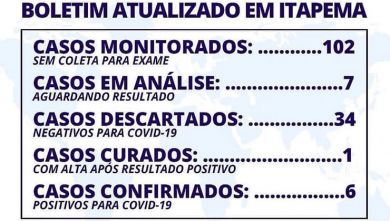 Subiu para seis o número de pacientes infectados pela covid-19, em Itapema. A informação foi divulgada pela prefeitura na tarde desta quarta-feira (8). Um dia antes o município contabilizava quatro casos positivos.