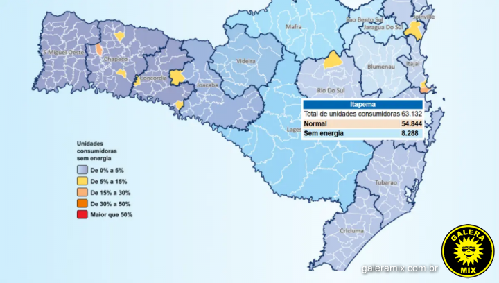 Já em Porto Belo, a falta de energia atingiu 5.347 residências, de um total aproximado de 18.234 unidades. O número representa quase um terço das ligações de energia do município.