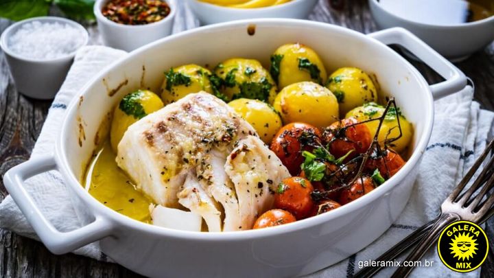 Bacalhau assado com batata e tomate-cereja (Imagem: Chatham172 | Shutterstock)