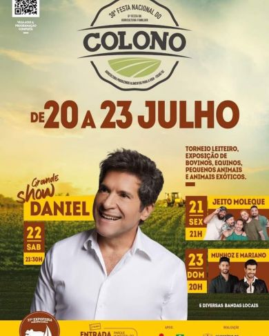 A 38ª Festa Nacional do Colono de Itajaí, que acontecerá entre os dias 20 e 23 de julho, terá três shows nacionais. Nesta edição, o cantor Daniel será a principal atração. O evento contará ainda com apresentação da banda de pagode Jeito Moleque e dos sertanejos Munhoz e Mariano. A festa será realizada no Parque do Agricultor, com quatro dias de atrações gratuitas.