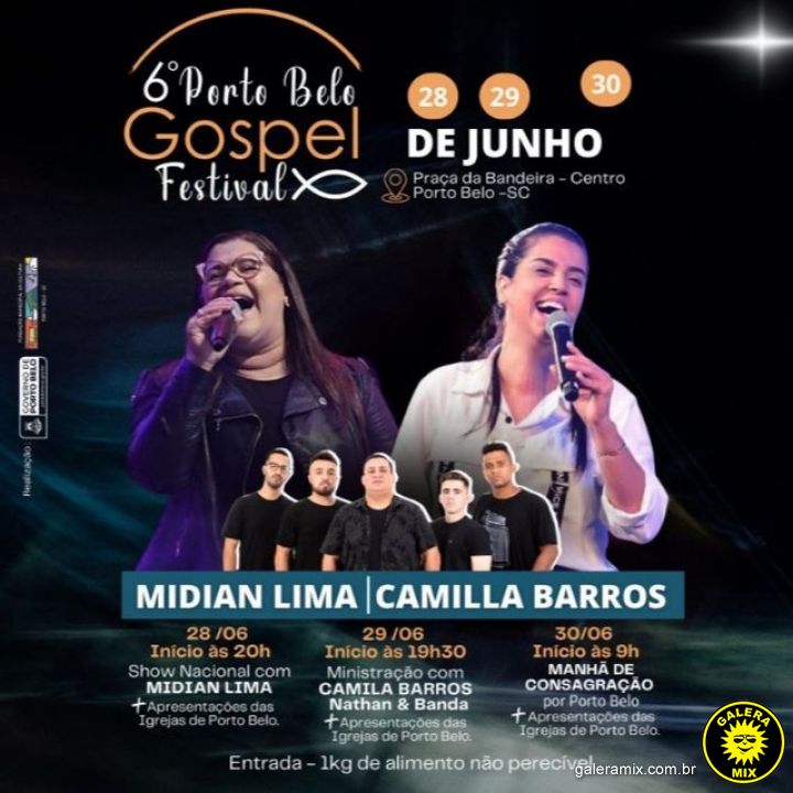 O evento acontece nos dias 28, 29 e 30 de junho, na Praça da Bandeira, em Porto Belo. Além do show e pregação com artistas evangélicos nacionais, o Festival também contará com apresentação das igrejas evangélicas de Porto Belo.