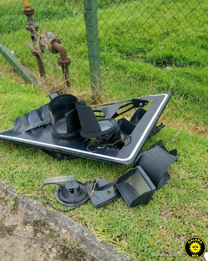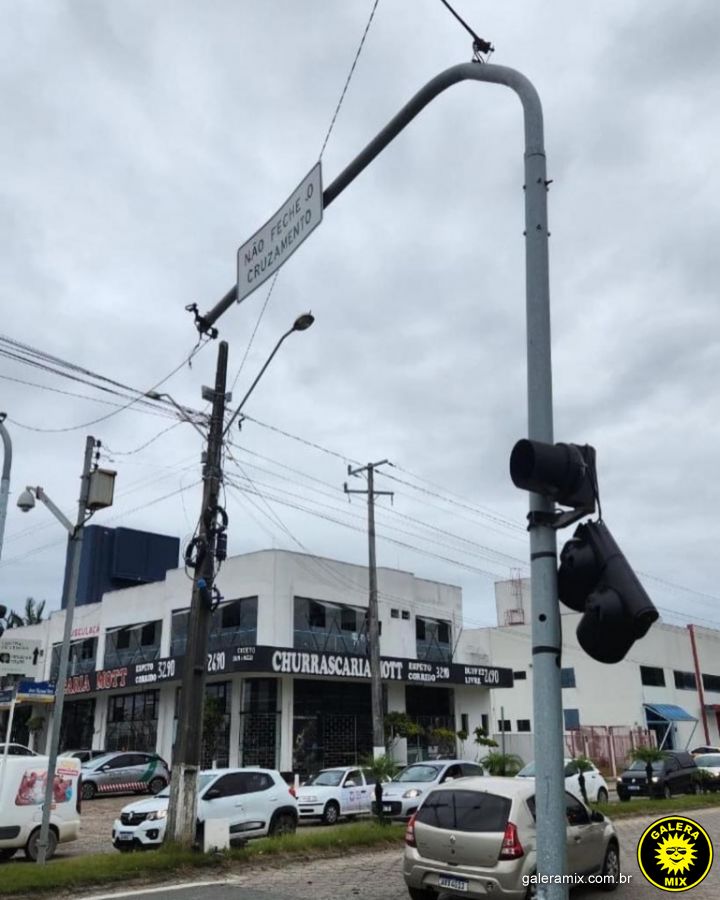 Um carro passou no sinal vermelho e obrigou um caminhão que vinha na via a desviar para evitar a colisão. Com o desvio do caminhão, o veículo acabou atingindo o semáforo do cruzamento, que ficou completamente danificado.