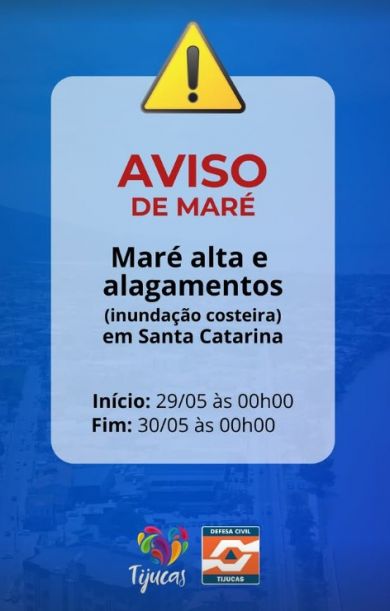 A Prefeitura de Tijucas emitiu nesta quarta-feira (28) um comunicado de alerta sobre a possibilidade de maré alta e inundação costeira no litoral de Santa Catarina, com início previsto para 00h00 de quinta-feira (29/05) e término às 00h00 de sexta-feira (30/05).