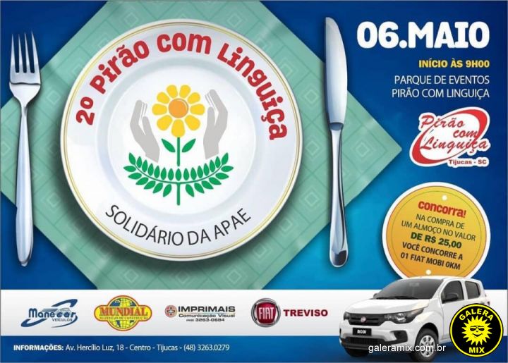 No próximo domingo, 6 de maio, a Associação de Pais e Amigos dos Excepcionais – APAE, de Tijucas, promove o 2º Pirão com Linguiça Solidário da entidade. O intuito é angariar recursos para reformas estruturais no prédio da unidade e as pessoas que contribuírem, participando do evento, ainda terão a oportunidade de ganhar um veículo 0km.