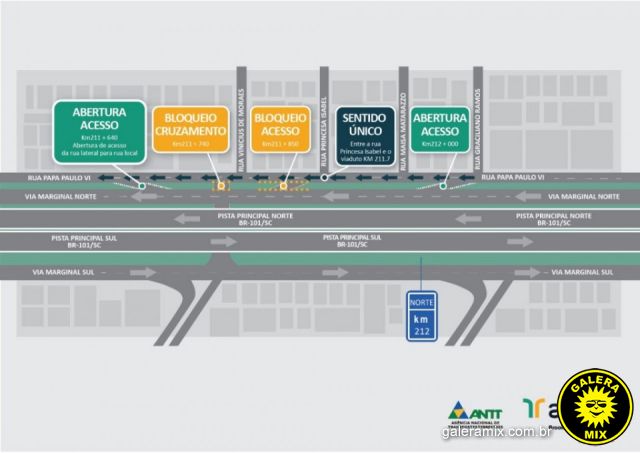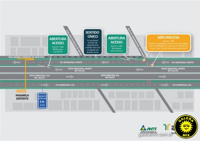 será realizada a abertura de um novo acesso da via marginal para rua Amaro Ferreira de Macedo (logo após o viaduto), viabilizando o acesso de quem transita pela rua lateral da BR-101/SC para o município;