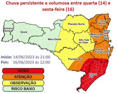 Conforme o órgão, a preocupação é para às próximas horas, onde são esperados acumulados em torno de 40 mm de chuva no Litoral Norte. Nas regiões da Grande Florianópolis e Litoral Sul também são esperados um grande volume de chuva, principalmente na madrugada desta sexta-feira (16). São esperados até 150 mm nesses locais. As regiões Litoral Sul (faixa vermelha do mapa) e Grande Florianópolis (faixa laranja no mapa), são as regiões com maiores riscos para ocorrências meteorológicas.