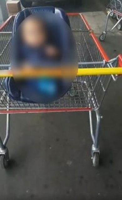 Imagens que circulam nas redes sociais mostram o bebê sozinho em uma cadeirinha acoplada ao carrinho.