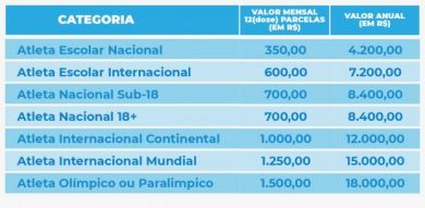 Mas o programa também beneficiará atletas de alto rendimento, com o objetivo de estimular a permanência do vínculo destes esportistas com clubes e entidades catarinenses. Foram criadas sete categorias que poderão ser pleiteadas.