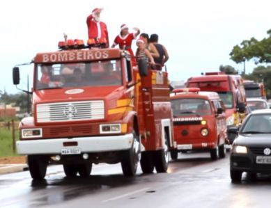 Viaturas dos bombeiros cortam as ruas da cidade, carregando o bom velhinho, distribuindo doces e brinquedos para a criançada.