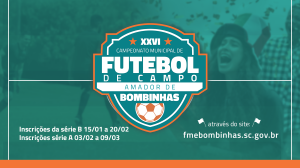 As inscrições para a vigésima sexta edição do Campeonato Municipal de Futebol de Campo de Bombinhas já estão abertas. Na primeira fase, se inscrevem as equipes da Série B (de 20 de janeiro a 20 de fevereiro) e na segunda fase, a Série A, entre os dias 3 de fevereiro a 9 de março. Para garantir a vaga as equipes devem acessar o http://twixar.me/blpT e ficar atento ao cronograma da competição.