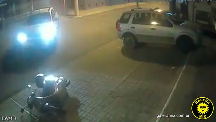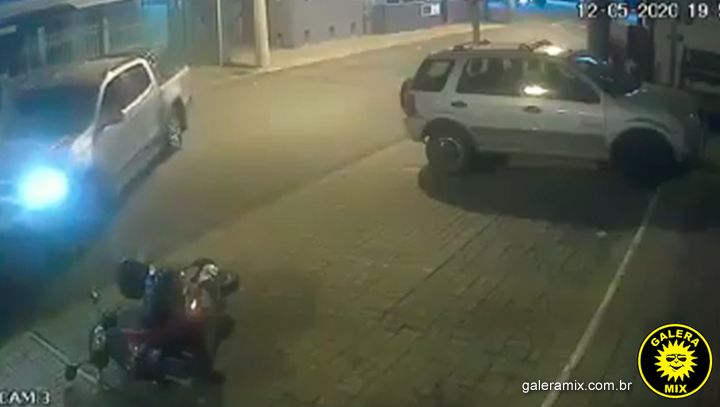 Nas imagens divulgadas é possível ver o exato momento em que o condutor da caminhonete derruba a moto ao sair da vaga de estacionamento, em seguida ele foge do local.