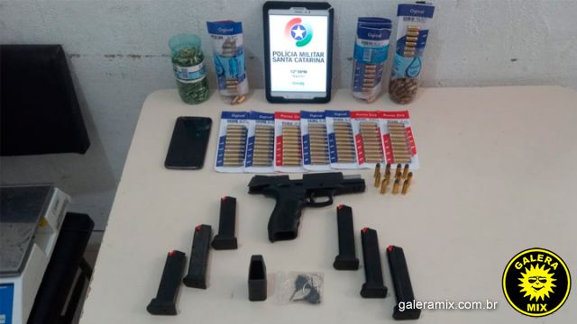 Ao chegar no local, a guarnição informou que o masculino teria negado a posse do objeto. Em busca realizada no imóvel uma arma calibre .380 com seis carregadores e 402 munições calibre .22, foram localizadas em baixo do colchão de um dos quartos.