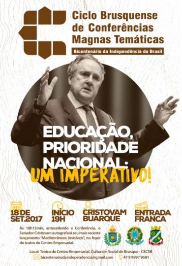 Na oportunidade, Buarque falará sobre o tema ‘Educação, Prioridade Nacional: Um Imperativo!’. A conferência será realizada às 19 horas no Teatro do Centro Empresarial de Brusque.