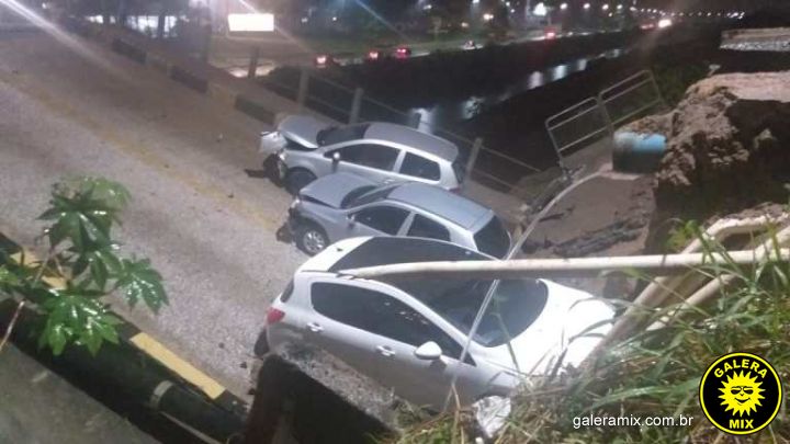 chegando no local , foi constatado que a cabeceira da ponte cedeu e junto com a base da ponte os veículos ficaram sustentados, não havendo queda dos veículos no rio.