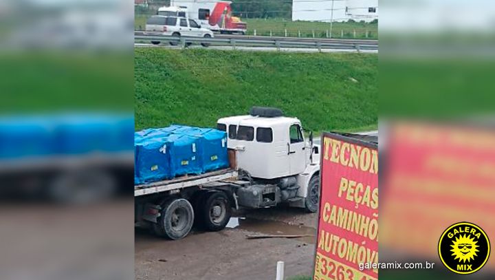 Uma cena chamou atenção de quem passava pela marginal da BR-101 em Tijucas, em um dos acessos a cidade. Um caminhão estava preso em um buraco na lateral da marginal Demóstenes Feminela.