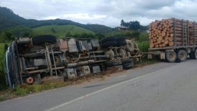 O caminhão carregado de madeira saiu da pista e tombou na lateral da pista.