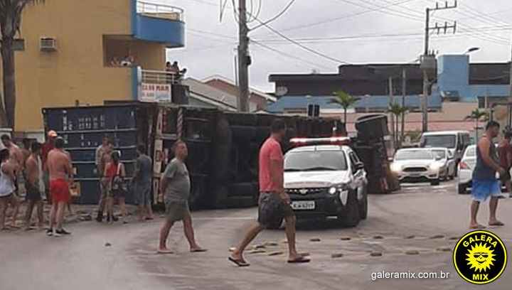 Em Bombinhas, um caminhão tombou em meio à avenida Leopoldo Zarling no início da manhã desta quarta-feira (22).