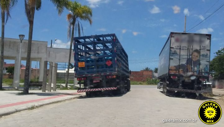 Dois caminhões estacionados na rua Geraldo Rebelo foram denunciados por moradores do Loteamento Mata Atlântica, por impedirem o trafego de veículos no local.