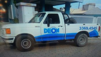 A Ford/F1000 branca estava plotada com os adesivos da empresa piscinas Deon e havia sido furtada durante a madrugada de quarta-feira (14) no bairro Vila Nova.