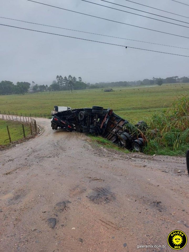 Nesta segunda-feira, 27 de maio, uma carreta carregada de cimento tombou nas proximidades da rodovia SC 410, entre as cidades de São João Batista e Canelinha. O acidente ocorreu em uma estrada de chão que dá acesso ao Bairro Cardoso, enquanto o veículo transportava cimento para uma empresa de artefatos próxima ao local.