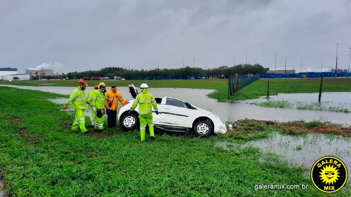 Um veículo capotou e acabou saindo da pista usada principalmente para caminhões de carga e descarga da Cerâmica Portobello. Parte do automóvel ficou submerso em uma área alagada às margens da rodovia.