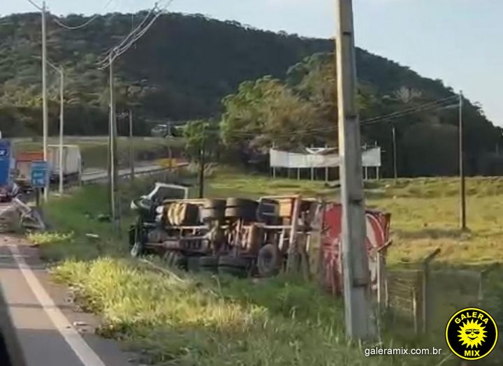 Um caminhão modelo Volvo/VM 270 tombou na tarde desta quarta-feira, 19 de junho, na altura do quilômetro 176 da BR-101, entre Tijucas e Biguaçu, no sentido Curitiba.