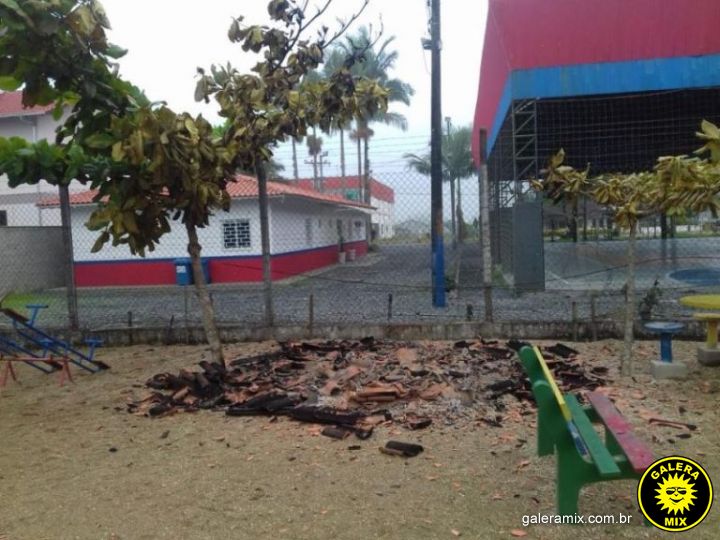 Uma casinha de madeira que ficava no pátio da Escola de Educação Básica Flora Auta Brasil , no Fernandes, para as crianças brincarem, foi vítima de vandalismo na madrugada desta sexta-feira, 30.
