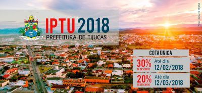 Começa nesta semana a entrega dos carnês de IPTU 2018 (Imposto Predial e Territorial Urbano) de Tijucas. Nos carnês, que serão distribuídos casa a casa, estão os boletos para pagamento em cota única, tendo o primeiro vencimento para 12 de fevereiro com desconto de 30% e a segunda cota única, com 20% de desconto e vencimento para dia 12 de março.
