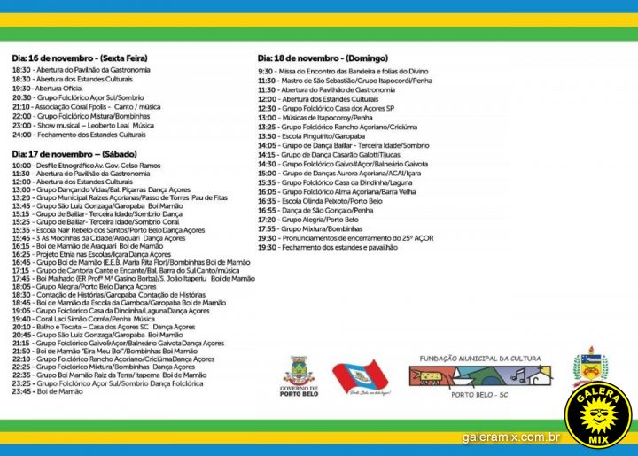 Para os três dias de festa estão sendo aguardados 40 expositores, com diferentes tipos de arte, além de dezenas de apresentações culturais, como boi-de-mamão, danças açorianas, contação de histórias, coral e outras.