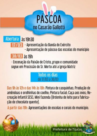 As oficinas acontecem das 9h às12h e das 14h às 18h. À noite, serão realizadas as apresentações de escolas do município. O Casarão Gallotti está recebendo uma decoração especial para a páscoa e ficará aberto à visitação todos os dias. Venha prestigiar o espaço decorado, traga sua família e participe!