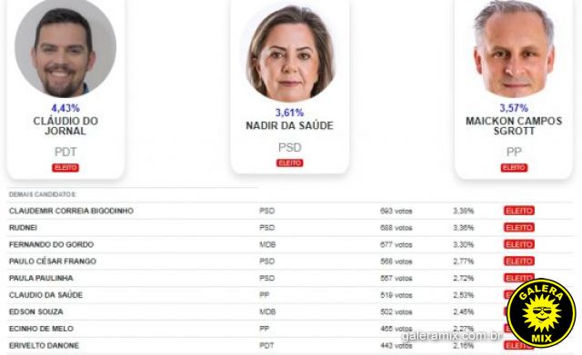Os outros 10 vereadores eleitos foram Claudemir Correia Bigodinho (PSD), Rudnei (PSD), Fernando do Gordo (MDB), Paulo César Frango (PSD), Paula Paulinha (PSD), Claudio da Saúde (PP), Edson Souza (MDB), Ecinho de Melo (PP), Erivelto Danone (PDT) e Maurício Poli (PSB).