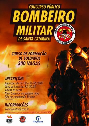O Corpo de Bombeiros Militar de Santa Catarina abrirá nesta terça-feira (1) as inscrições para o concurso de seleção de novos soldados da corporação. Entre as 300 vagas oferecidas, 282 delas serão para homens e 18 para mulheres. As inscrições, que têm uma taxa de R$ 150, devem ser feitas até o fim de agosto, pelo site do concurso público.