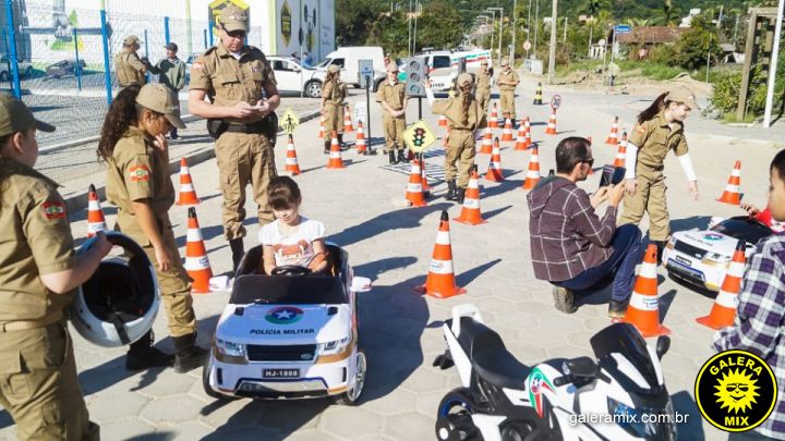 Os Policiais Mirins ainda utilizaram uma pista da escolinha de trânsito para guiar as outras crianças pelo caminho, para mostrar como se deve comportar, com respeito à sinalização e aos pedestres.