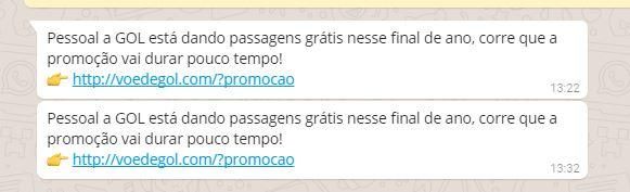 Nesta quarta (15), um novo golpe envolvendo a companhia aérea GOL está se alastrando pelo WhatsApp. Na mensagem, que tem sido compartilhada em muitos grupos do aplicativo, os usuários são convidados a entrar em um site para preencher seus dados e ganhar passagens gratuitas válidas para o fim do ano; veja: