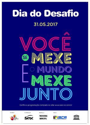 “Você se mexe e o mundo mexe junto” é o lema do Dia do Desafio, evento mundial que incentiva a prática regular de atividades físicas, realizado anualmente na última quarta-feira do mês de maio. Em Santa Catarina 215 cidades vão aderir ao movimento sob o comando de Unidades do Sesc, prefeituras municipais e diversas parcerias locais, com o tema "Cidades ativas e criativas".