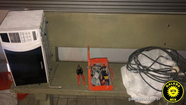 Em seguida a guarnição recebeu a informação de que outro furto estaria sendo praticado por dois homens em um prédio em construção, na rua 412A esquina com 428. Ao chegar no local foi abordado um homem fora da construção, já na parte interna foi flagrado o outro com um microondas e diversos fios cortados, já separados para serem levados.