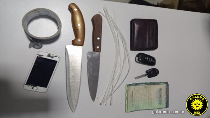 A PM relatou que a dupla estava em um veículo gol, de placas OkG-8556 da cidade Palhoça, identificado posteriormente e apreendido. O objetivo dos criminosos era prender a vítima e roubar dinheiro, joias e objetos de valores da residência. No automóvel dos rapazes haviam facas, fita adesiva e abraçadeiras de nylon.