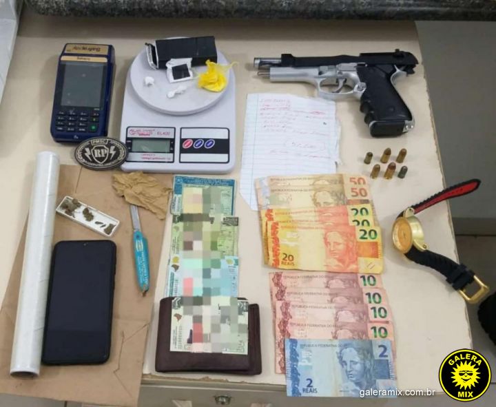 Na sequência, fora encontrado dentro do bar onde o mesmo administra, 4 munições cal .380, 2 micropontos de LSD, 1 porção de maconha, Balança de precisão, um canivete com resquícios de substância análoga a maconha, uma máquina de cartão de crédito, um celular de marca Samsung de cor preto e R$814,00.