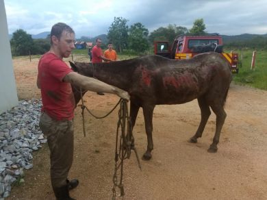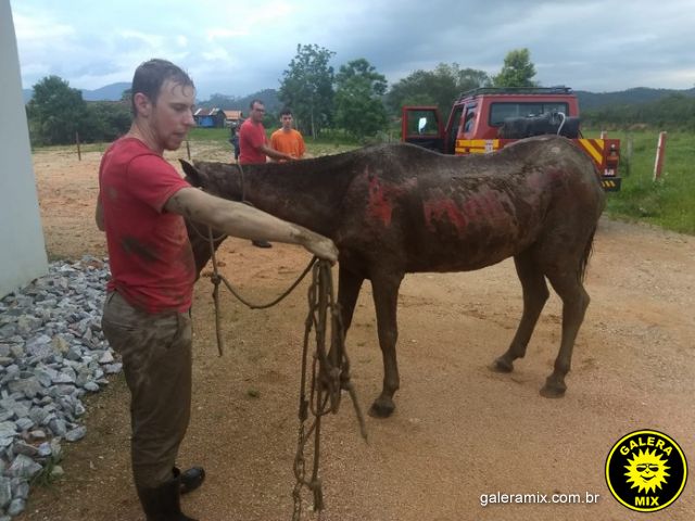 Uma égua foi resgatada na tarde desse domingo (2), por volta das 17h40, em São João Batista, na Grande Florianópolis. O animal estava dentro do Rio Tijucas, amarrado com uma corda cheia de nós. O trabalho foi feito pelo Corpo de Bombeiros, com a ajuda de populares.