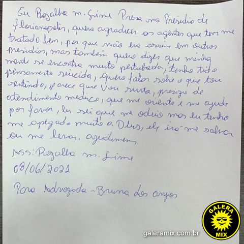 Diretamente do Presídio de Florianópolis onde encontrasse detida, Rozalba Grime, a assassina confessa de Flávia Godinho Mafra escreveu uma carta com pensamentos suícida e entregou para a advogada de defesa Bruna dos Anjos.