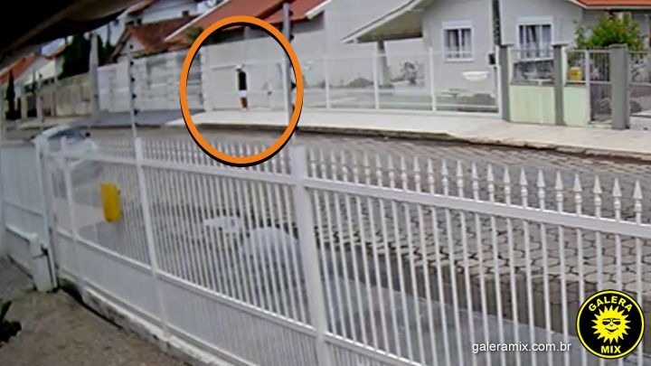 Ele passa em frente a um dos imóveis, anda mais alguns metros e retorna. O criminoso se aproxima do portão e consegue desencaixá-lo, permitindo sua abertura. Dentro do terreno, ele ronda a casa e consegue acessar o seu interior através de uma janela.